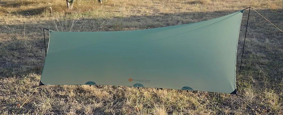 - Gedacht für den Aufbau mit (optionalen) Trekkingstöcken, die wenigstens 115 cm lang sein sollten, alternativ mit Tarpstangen oder Stöcken mit eben diesem Maß