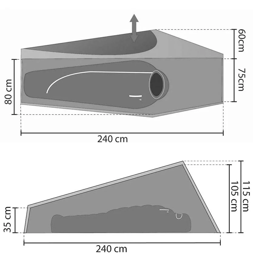 Innenzelt Liegefläche: 235 x 75 cm (L x B) – ausreichend Platz für Menschen bis 185 cm Körpergrösse. Innenzelt am niedrigen Ende hoch genug, um Kontakt Schlafsack-über Fußspitzen auszuschliessenGewicht & Packmaß: