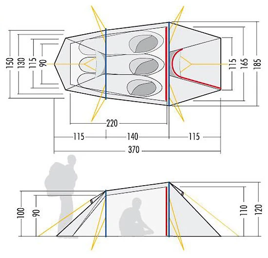 Gestänge 7001/T6 Alu eloxiert, 9.5 mm. 2 Bögen - Innenzeltmaße: Länge 220 cm, Breite 165 cm bzw. 90 cm, Höhe 110 cm bzw. 90 cm